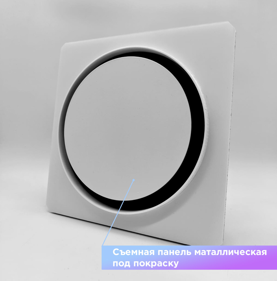Так же диффузор состоит из металлической заслонкой, которой можно регулировать поток воздуха, либо полностью перекрыть его. К заслонке с помощью магнитов крепится декоративная круглая панелька, которую можно покрасить в цвет потолка. Так же по ободку диффузора имеется молярная сетка, для надёжной фиксации шпаклёвки. Наши диффузоры оснащены москитной сеточкой, которая препятствует попаданию насекомых в помещение.